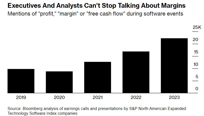 统计机构对财报电话会议、公司活动和其他演示文稿的分析数据显示,软件行业的高管们和华尔街分析师在2023年谈论利润的频率是2019年的两倍多。相比之下,同期提及“增长”和“营收”的速度和频率还不到利润的一半。
