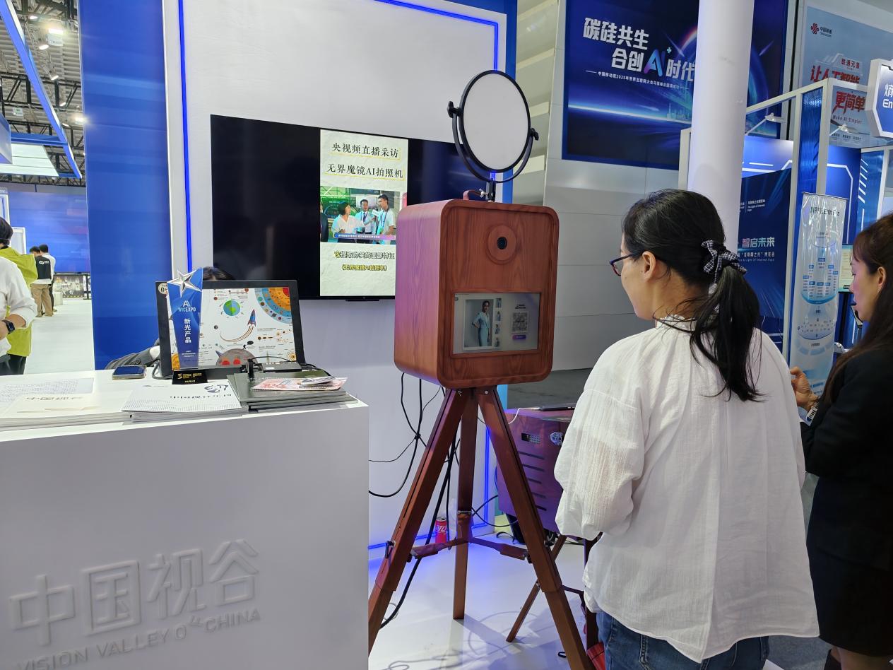 观众体验中国视谷的无界魔镜AI拍照机,其内置数百款风格迥异的写真模板,依托AI视觉大模型,具备强大的影像生成能力。中国经济网记者李方/摄